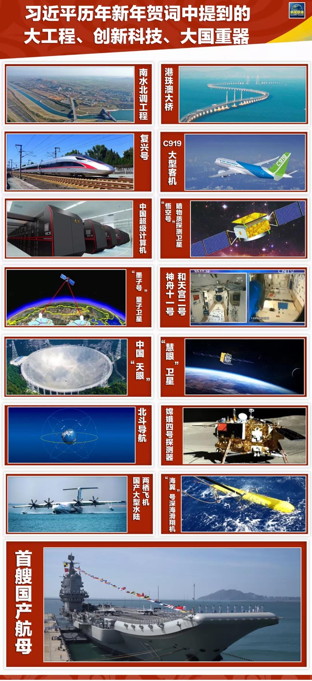 習(xí)主席的新年賀詞,還多次提到我國(guó)的一些大工程和科技創(chuàng)新成果,有的還不止一次被提及。比如,“國(guó)產(chǎn)航母”“暗物質(zhì)探測(cè)衛(wèi)星”等就都被提到了兩次。